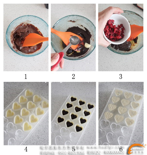 白巧克力300克、黑巧克力65克、淡奶油36ml、黄油1克、橙酒1勺、蔓越莓干20克